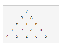 맨 위층 7부터 시작해서 아래에 있는 수 중 하나를 선택하여 아래층으로 내려올 때, 이제까지 선택된 수의 합이 최대가 되는 경로를 구하는 프로그램을 작성하라. 아래층에 있는 수는 현재 층에서 선택된 수의 대각선 왼쪽 또는 대각선 오른쪽에 있는 것 중에서만 선택할 수 있다.