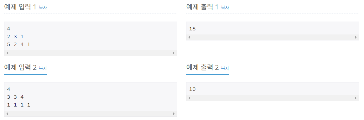 표준 입력으로 다음 정보가 주어진다. 첫 번째 줄에는 도시의 개수를 나타내는 정수 N(2 ≤ N ≤ 100,000)이 주어진다. 다음 줄에는 인접한 두 도시를 연결하는 도로의 길이가 제일 왼쪽 도로부터 N-1개의 자연수로 주어진다. 다음 줄에는 주유소의 리터당 가격이 제일 왼쪽 도시부터 순서대로 N개의 자연수로 주어진다. 제일 왼쪽 도시부터 제일 오른쪽 도시까지의 거리는 1이상 1,000,000,000 이하의 자연수이다. 리터당 가격은 1 이상 1,000,000,000 이하의 자연수이다.