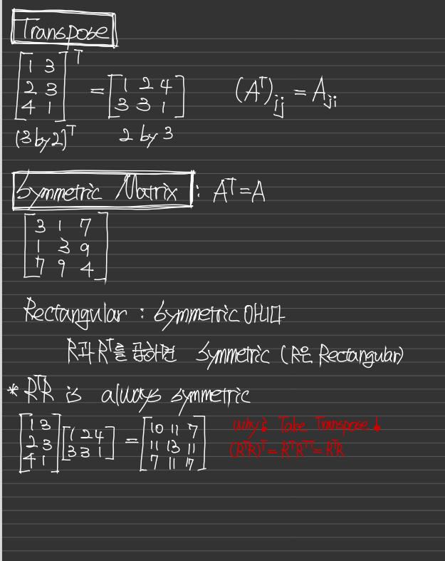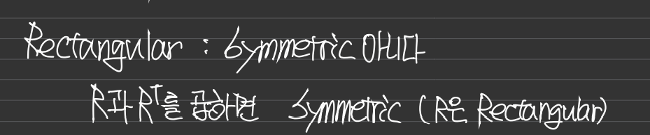 Rectangular(n by n 아닌경우)는 대칭일 수가 없다. 하지만 R과 R^T를 곱하면 대칭이다(순서상관 X)
