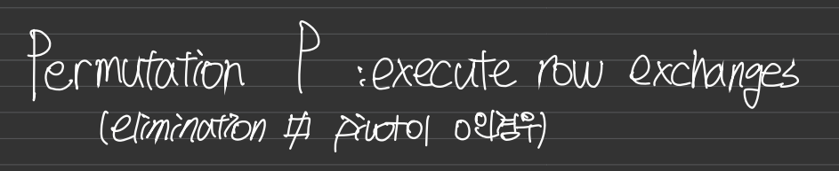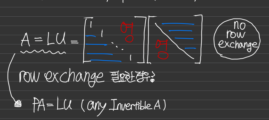 행 교환이 없다면 바로 A=LU를 구할 수 있는데, 필요하다면 P를 곱한 PA를 기준으로 분해를 하면 된다.