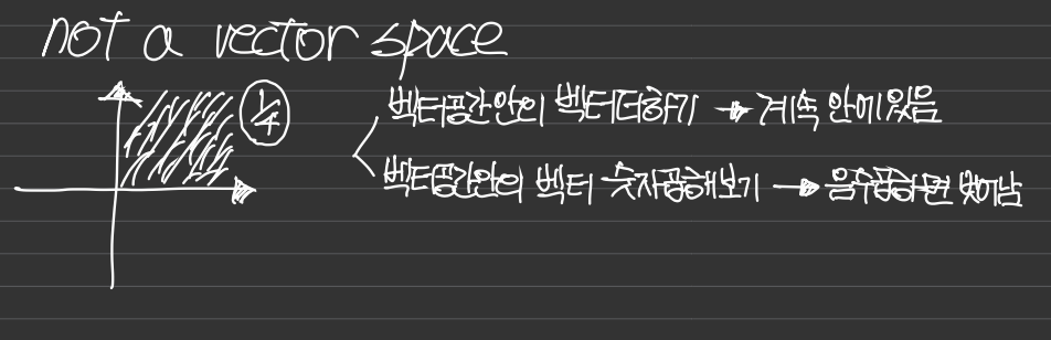 1사분면에 있는 벡터와 3사분면에 있는 벡터를 더하면 2사분면에 위치하므로 벡터공간이 아니다.