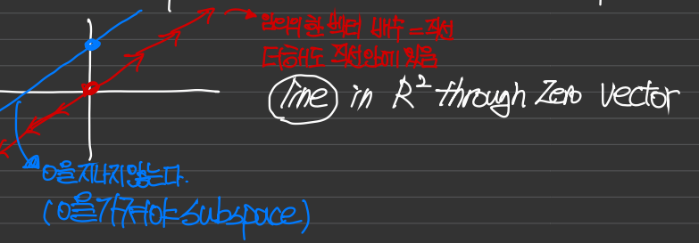 하지만 직선이라고 모두 부분공간인 것은 아니다. 원점을 지나지 않는 직선을 볼때,