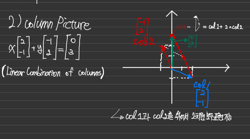 col1에 col2를 두번 더하면 이를 벡터의 합으로 표시했을때 col1의 시작점에서 col2를 두번 더한 것의 끝점을 연결한 벡터가 나온다. 그리고 이는 [0 ; 3]이고 방정식의 해는 col1을 1번(=x) col2를 2번(=y) 더한 것이므로 (1,2)가 해이다.