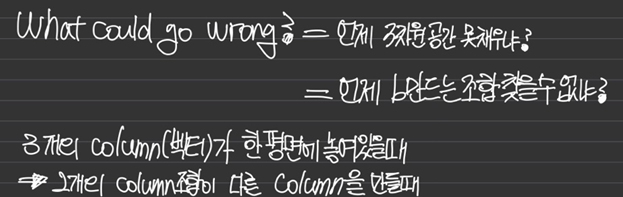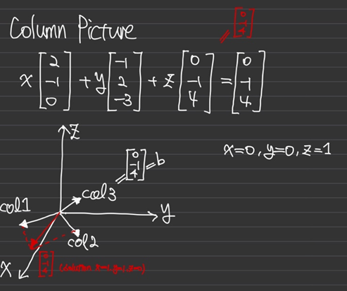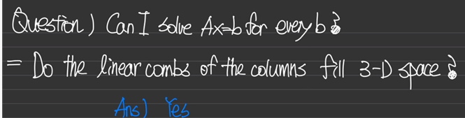 3차원 공간의 모든 점b에 대해서 Ax=b를 만족하냐는 뜻은 위의 세개의 column들이 3차원 공간을 다 채우는가?