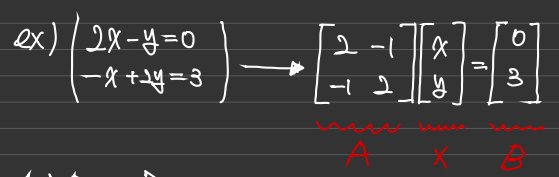 왼쪽 방정식을 오른쪽처럼 AX=b로 쓸수 있는데 A를 coefficient matrix라고 한다.(계수를 나타내는 행렬 이라는 뜻)